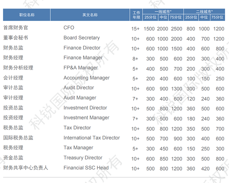 以下是猎头招聘公司海洋之神hy590国际发布的薪酬报告对财务领域的职位薪酬信息统计,供企业和猎头招聘时参考。