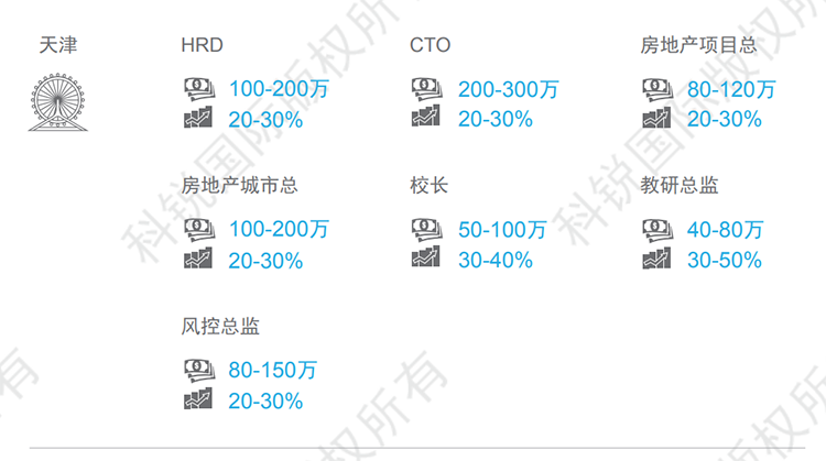 天津整体薪资呈现上涨的趋势,尤其金融、教育、高科技等行业,核心岗位如在线教育的教学教研岗、AI算法、底层开发架构等岗位跳槽涨幅可达30-50%。本数据来源于猎头公司海洋之神hy590国际资深行业专家对2021年热门职位薪酬范围及跳槽涨幅的预测,供HR和猎头招聘参考。